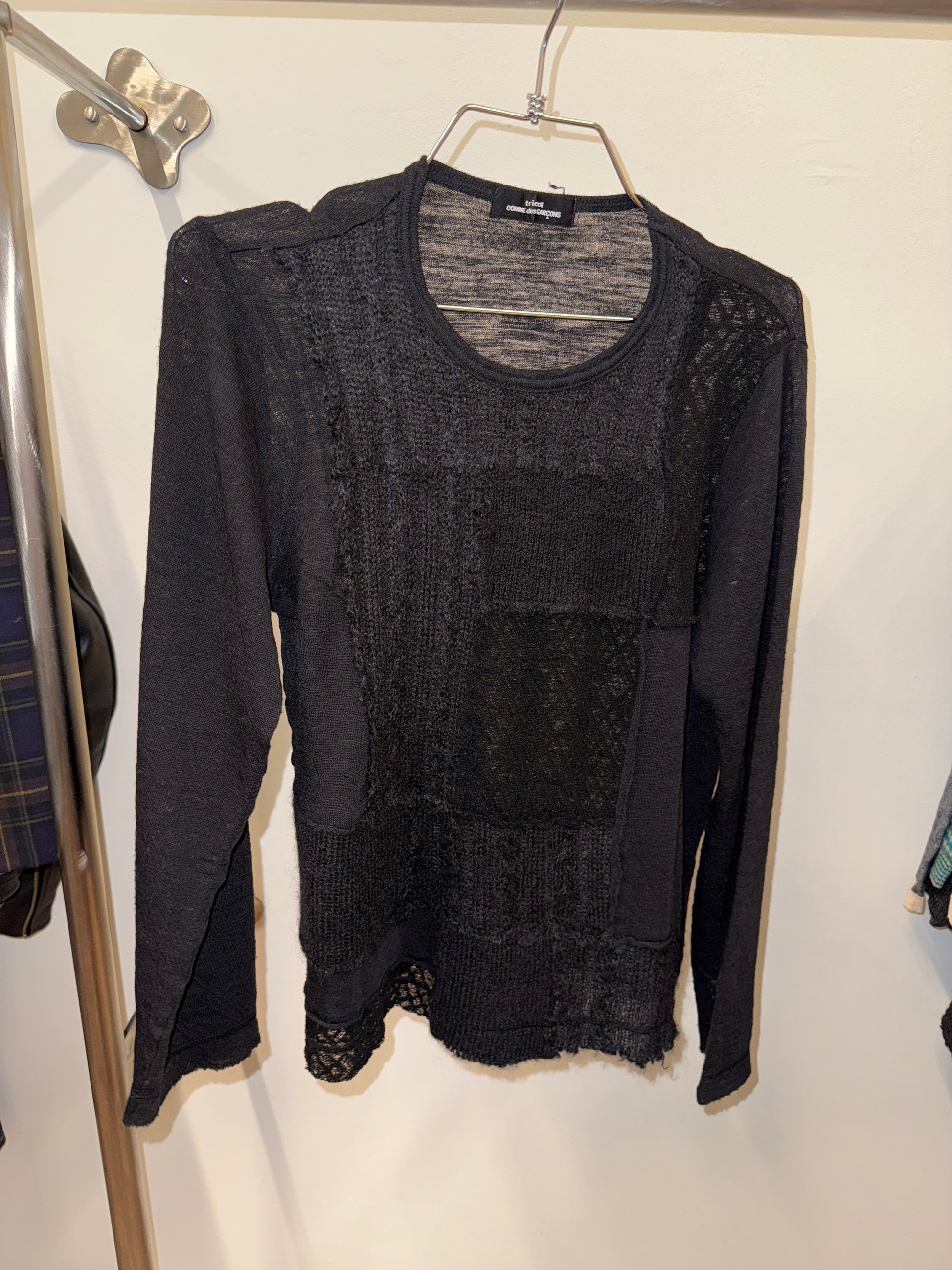 Patchwork knit construction with mixed textures, sheer panels and raw, intentionally distressed edges. Lightweight, semi-transparent in parts, designed for layering with a worn-in, poetic finish.