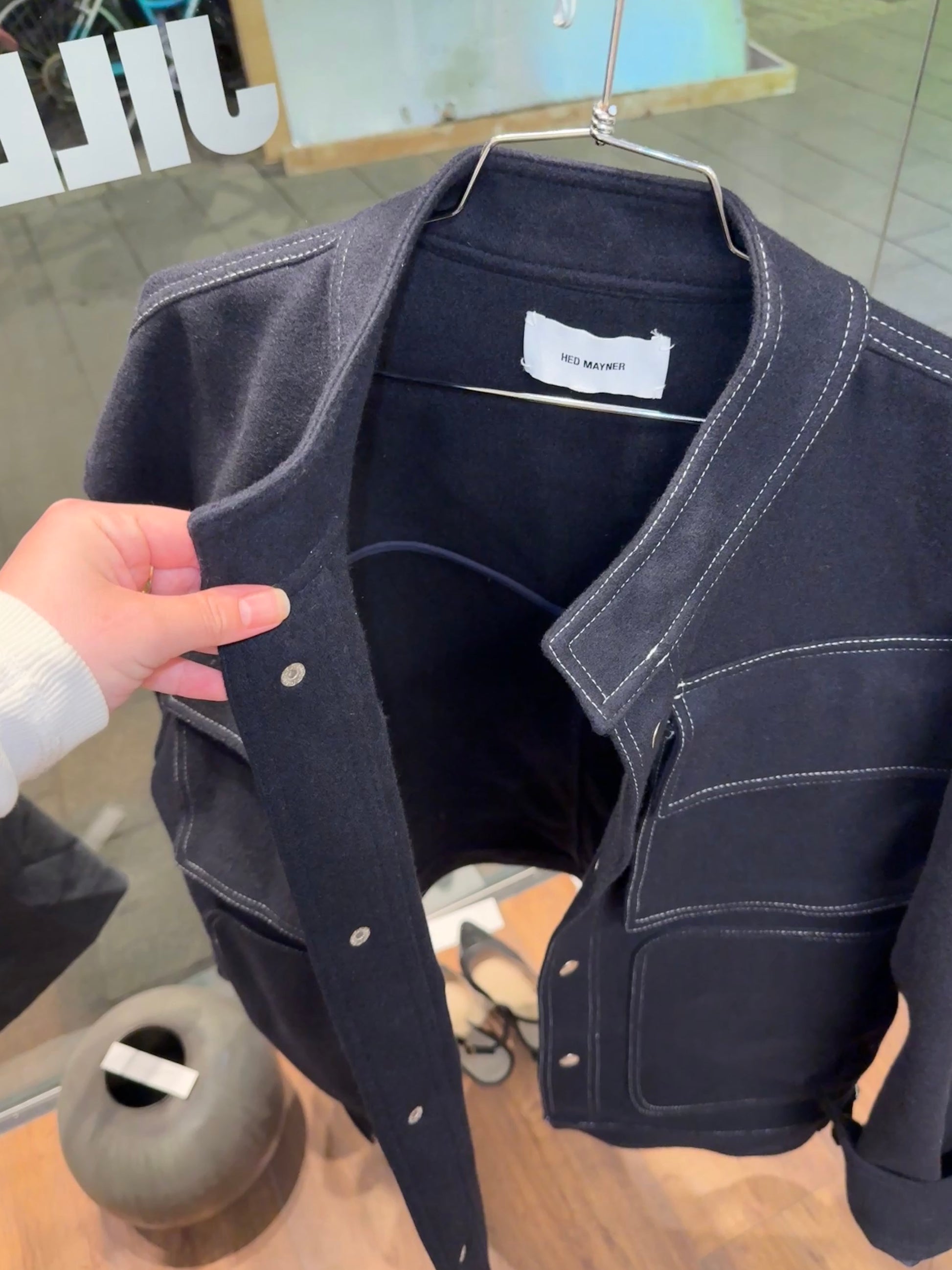 A true Hed Mayner outerwear piece — exaggerated volume, uniform references and controlled proportions.