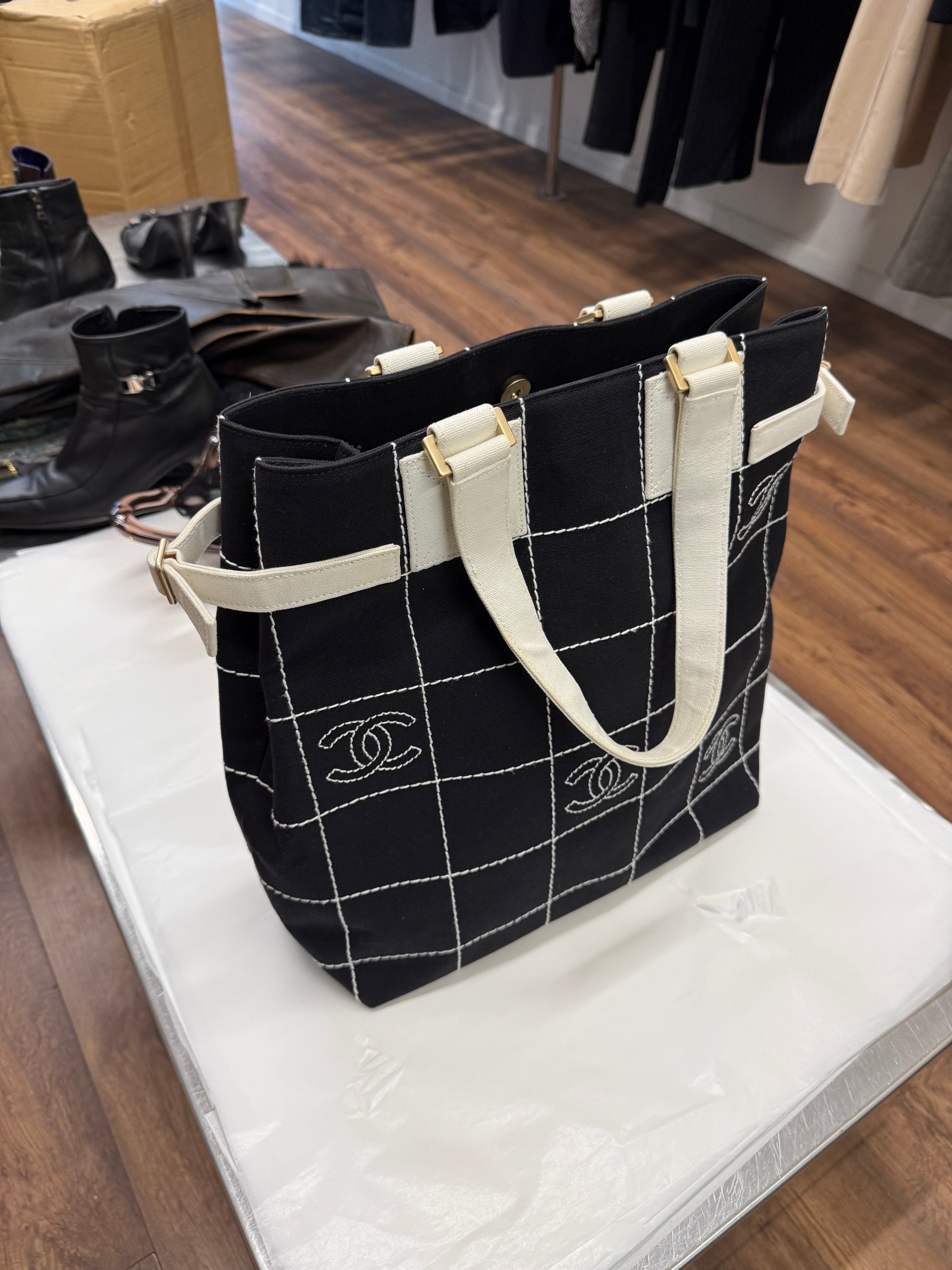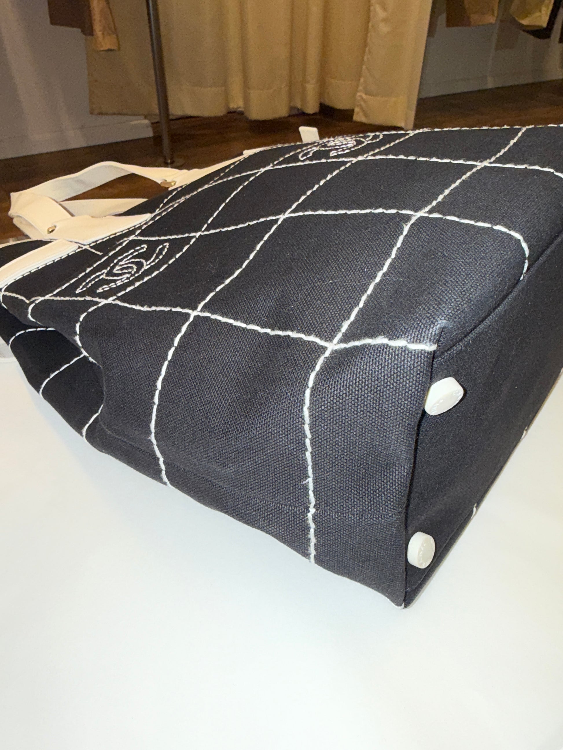 Vintage Chanel canvas tote bag from the early 2000s, crafted in black quilted canvas with contrasting white topstitching and embroidered CC logos. Structured silhouette with adjustable side straps, canvas handles and metal hardware engraved CHANEL. Finished with base feet.