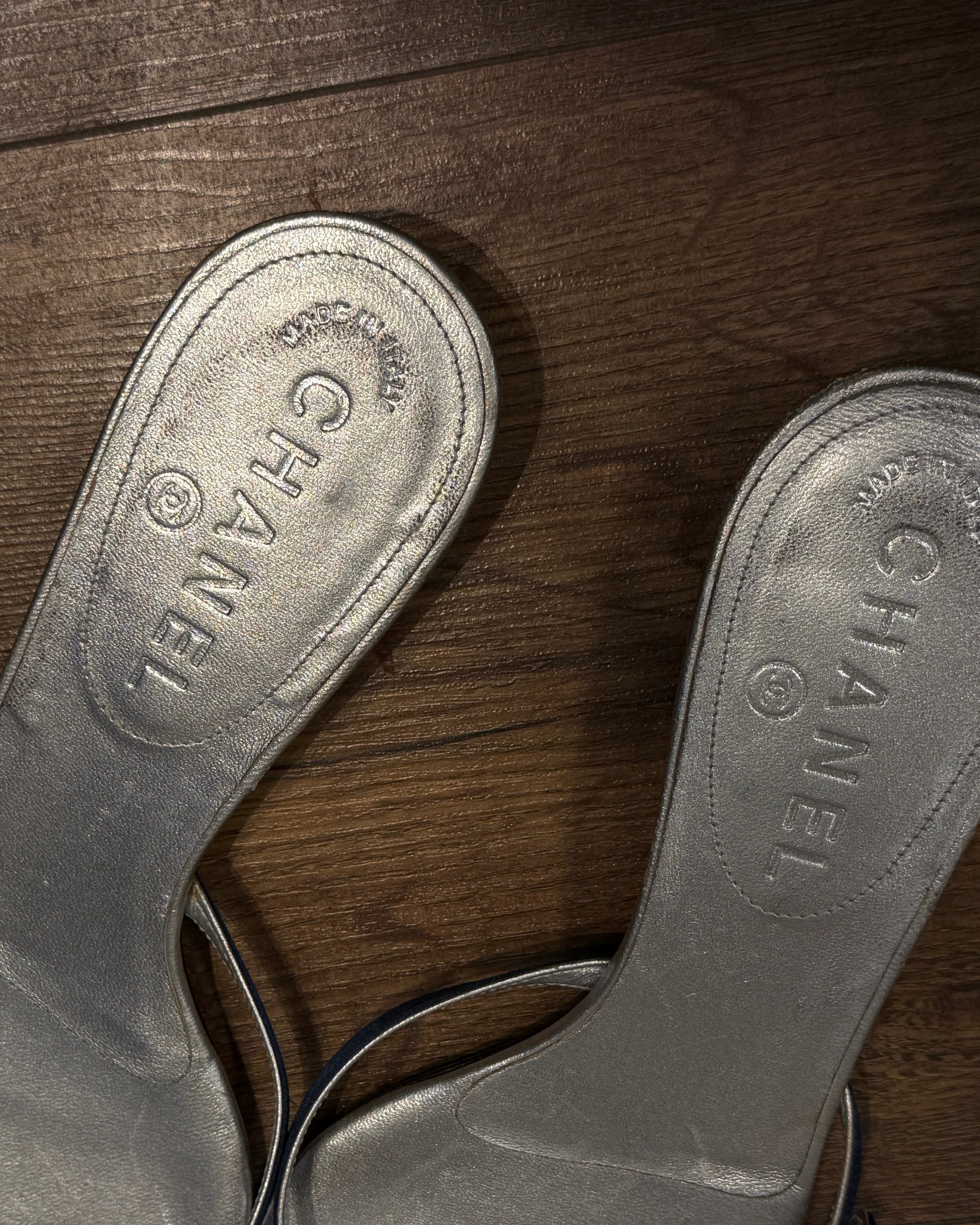 Chanel Silver & Navy Kitten Heel Mules 2000s