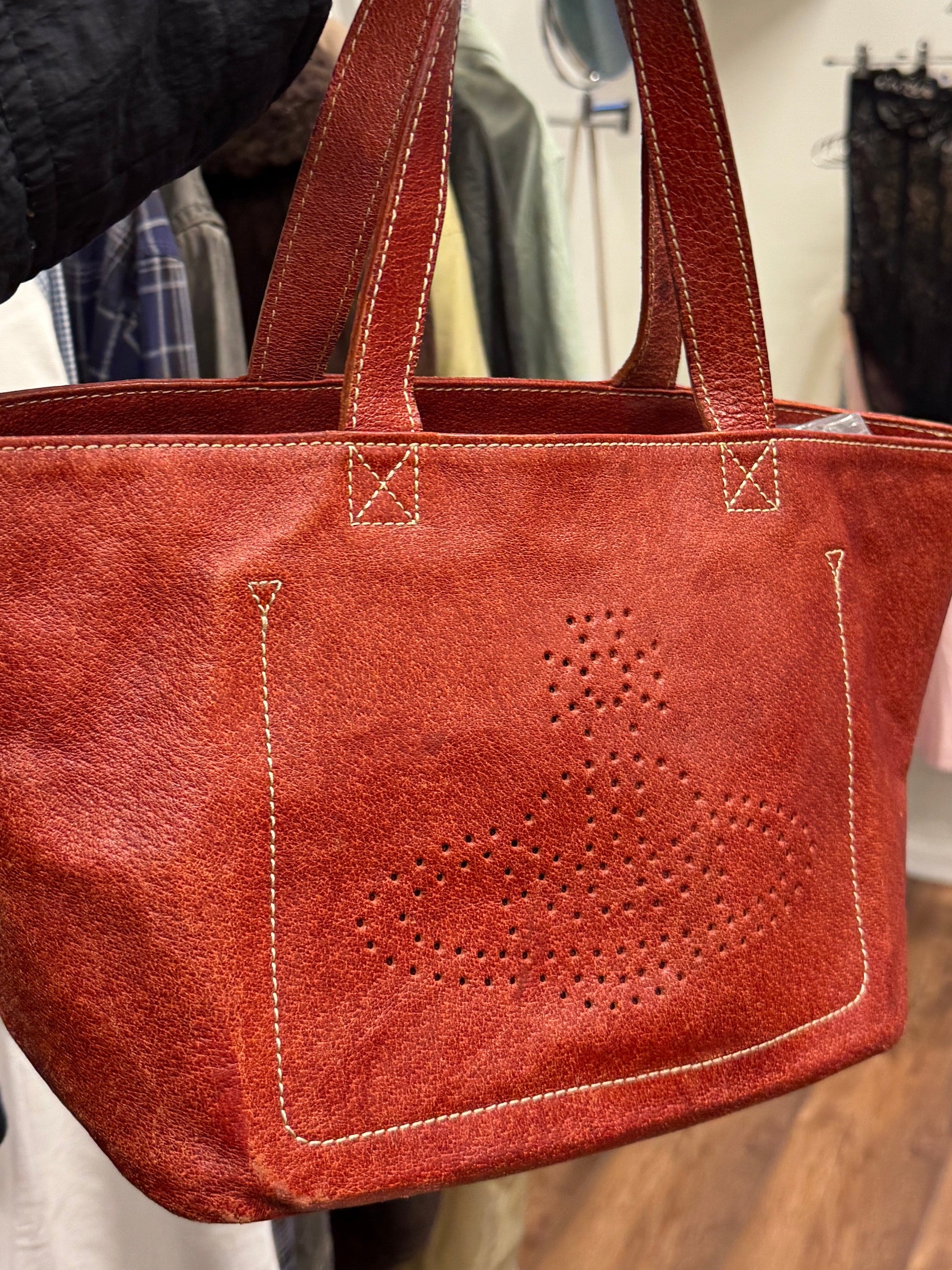 Archival Vivienne Westwood red leather tote from the late 1990s–early 2000s.