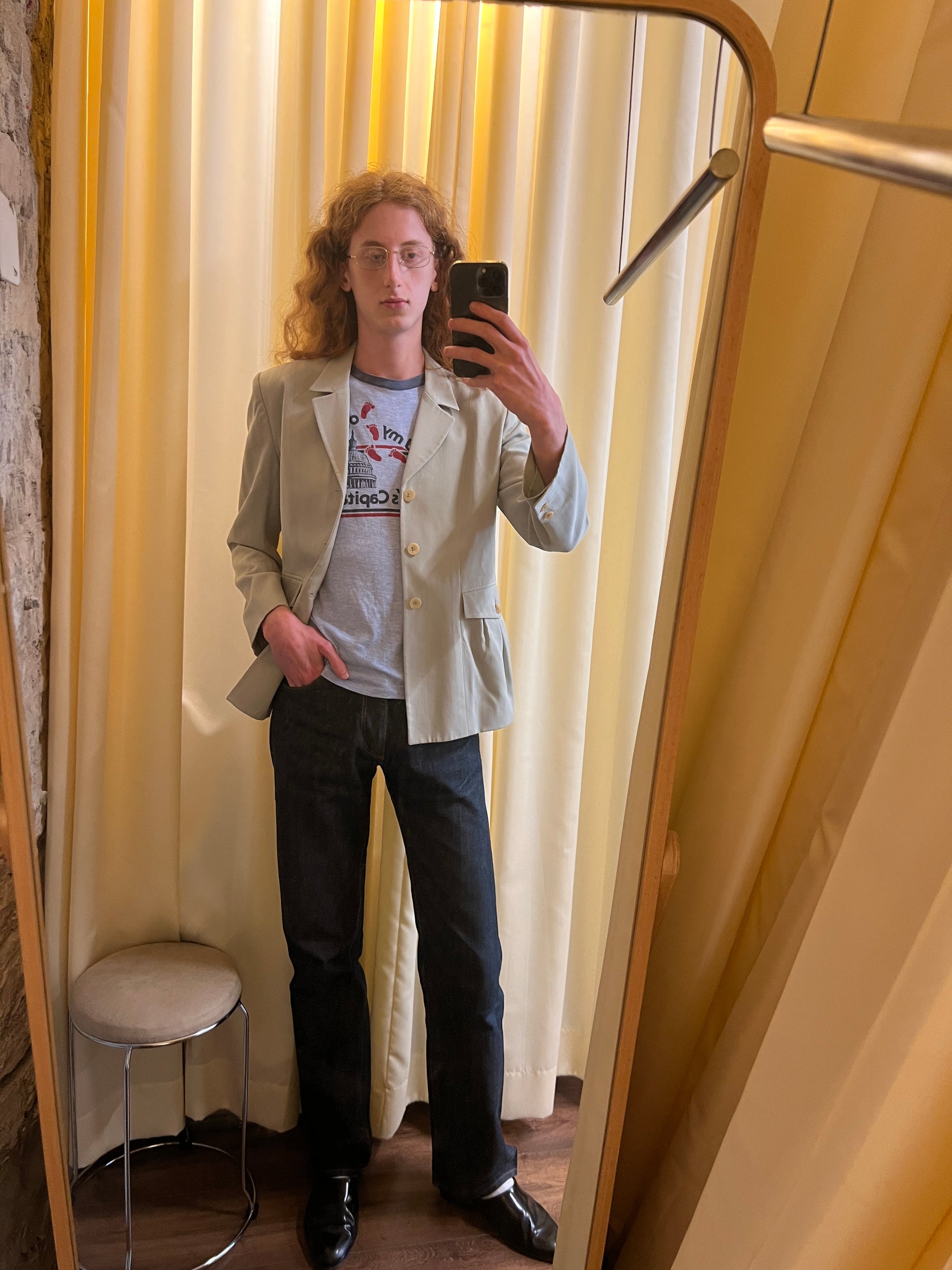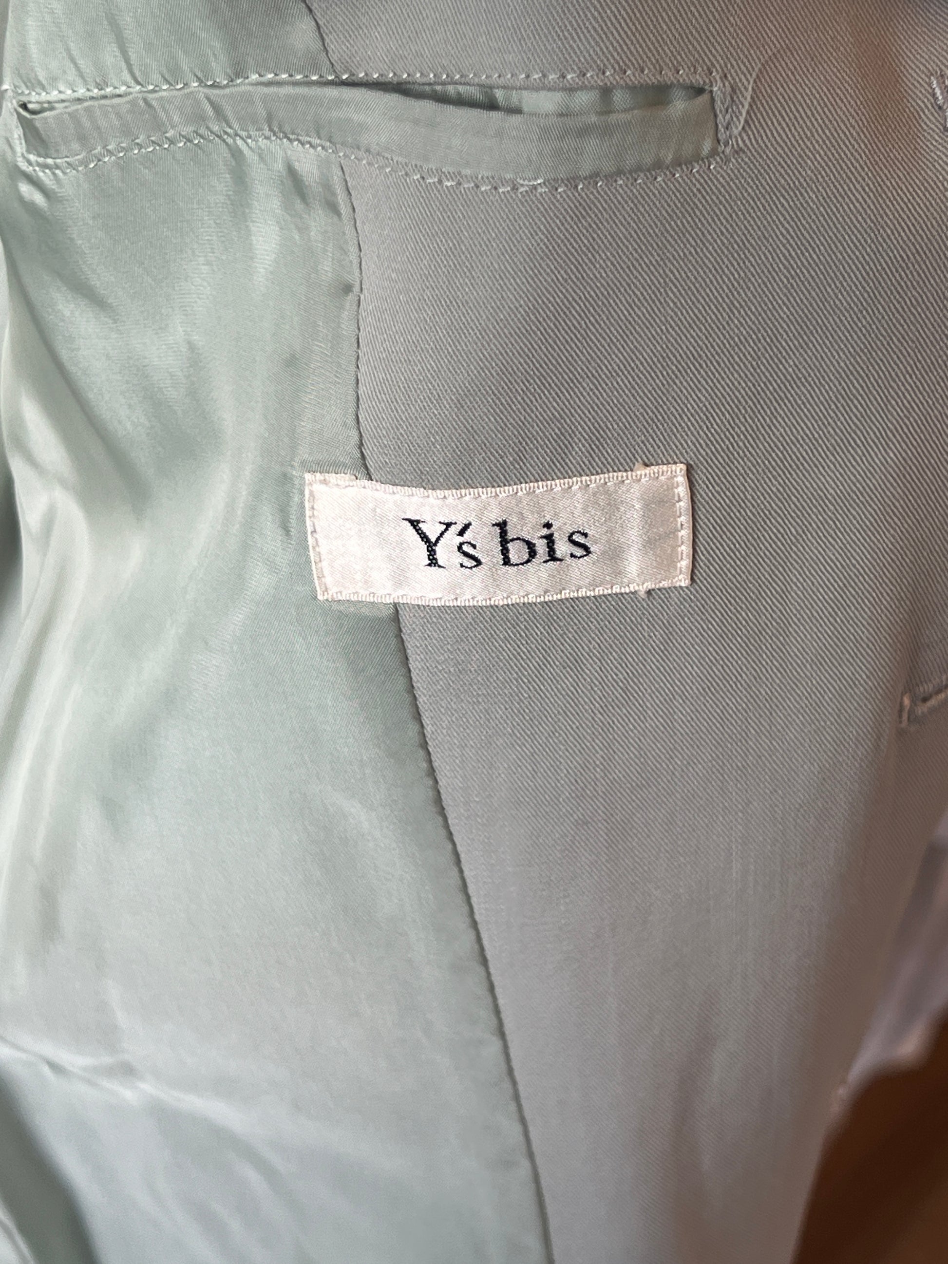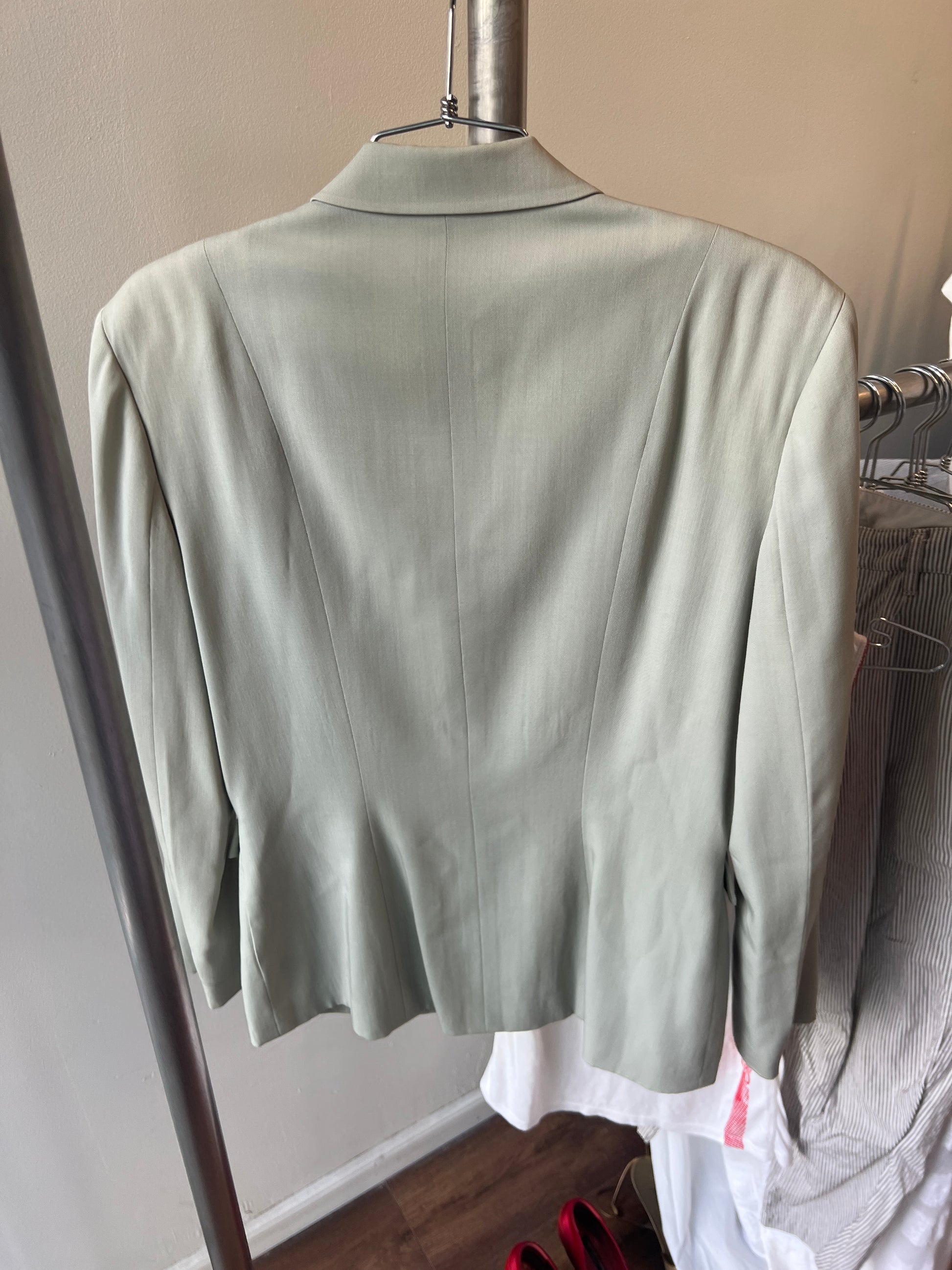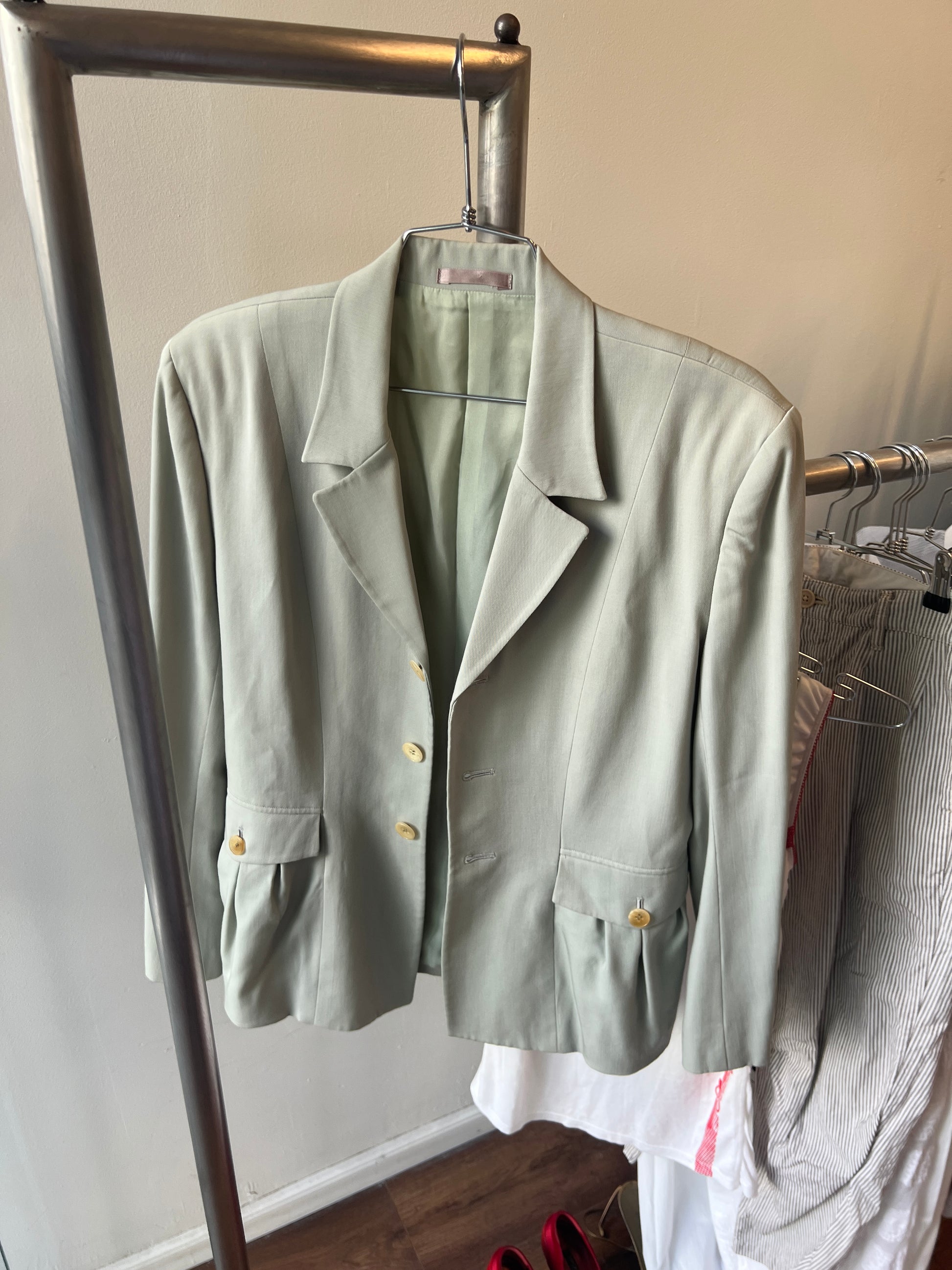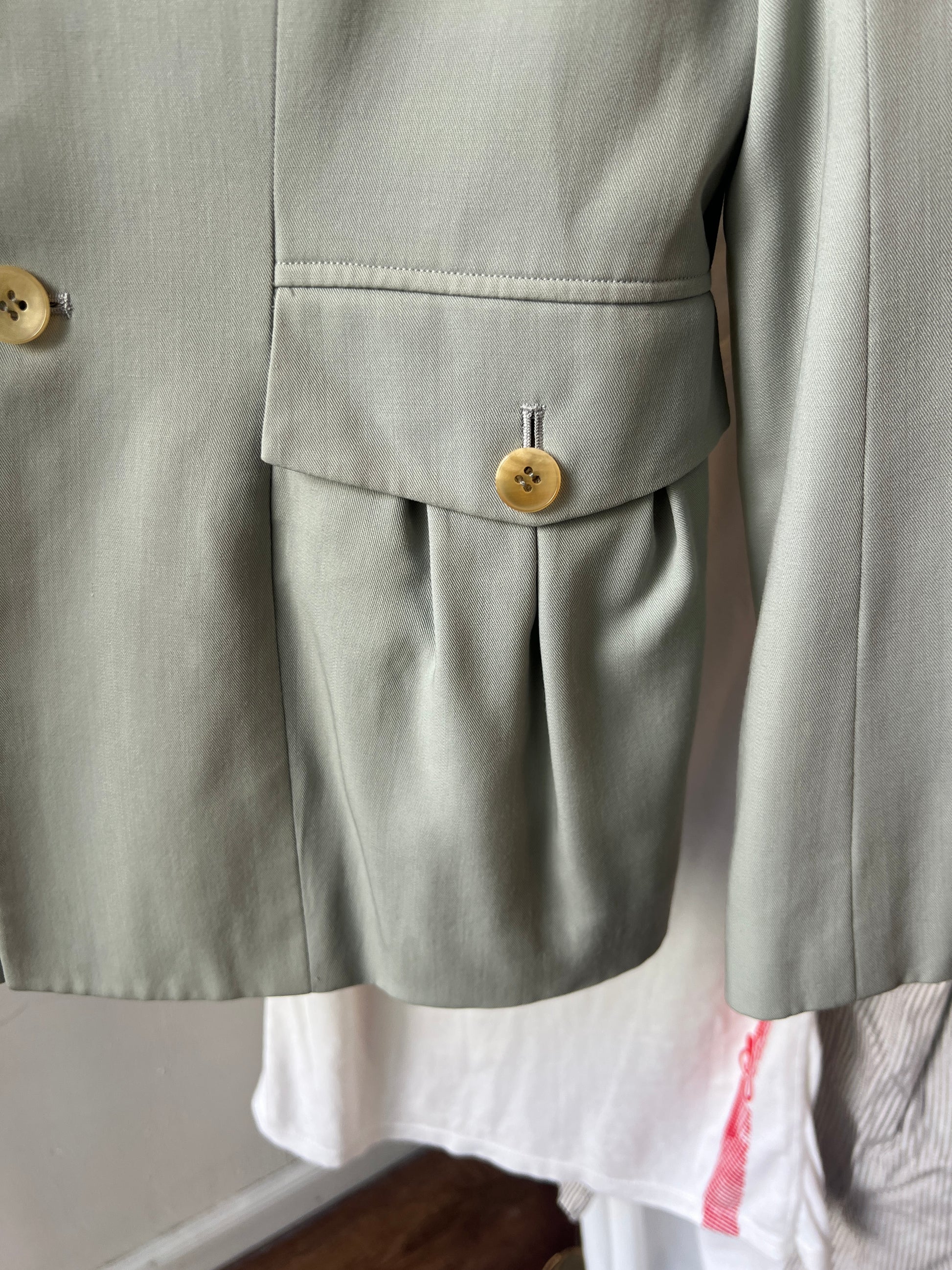 greyish mint tailored blazer closed by three yellowish buttons that are also featured on 2 pleated pockets at the front