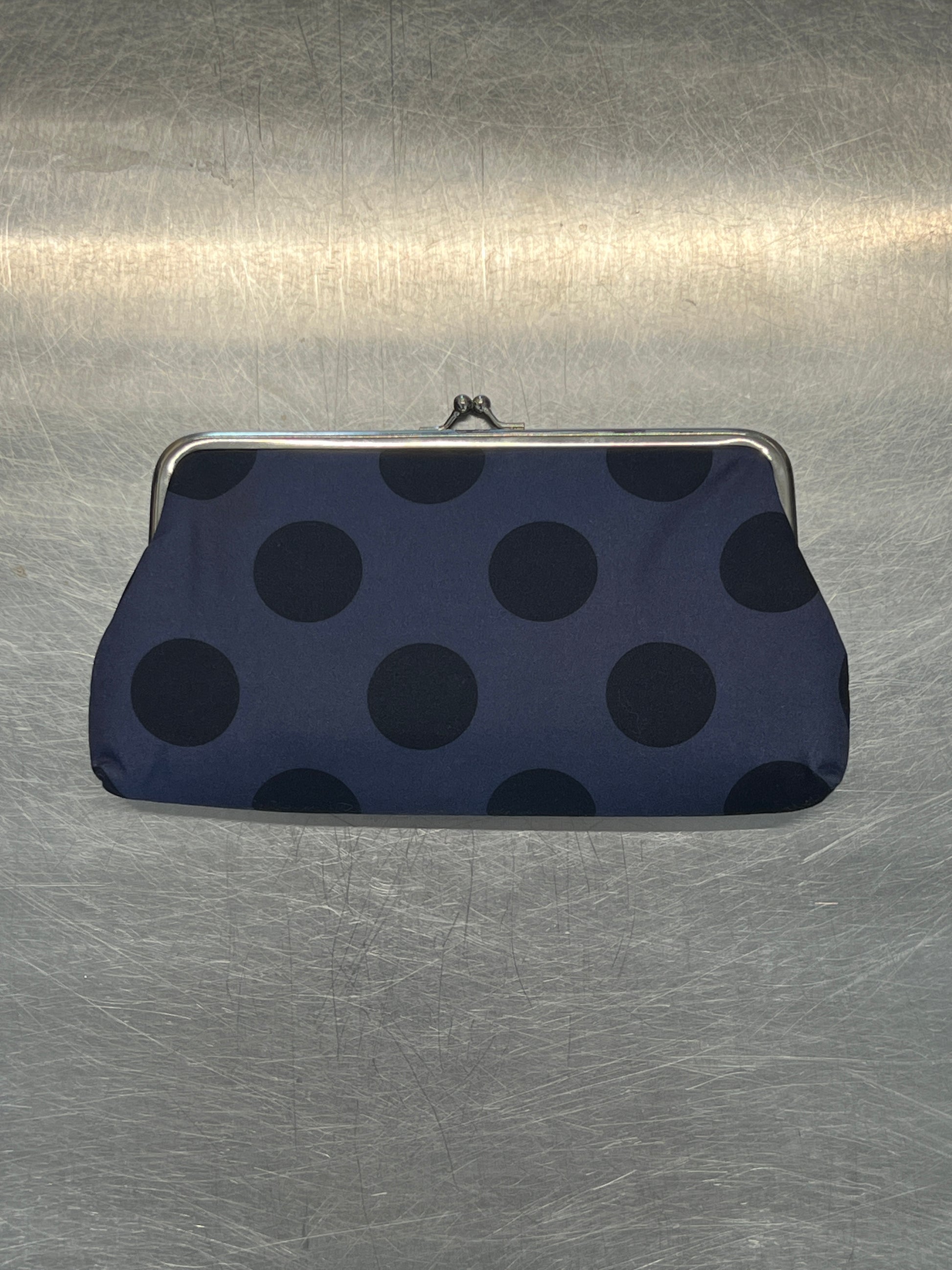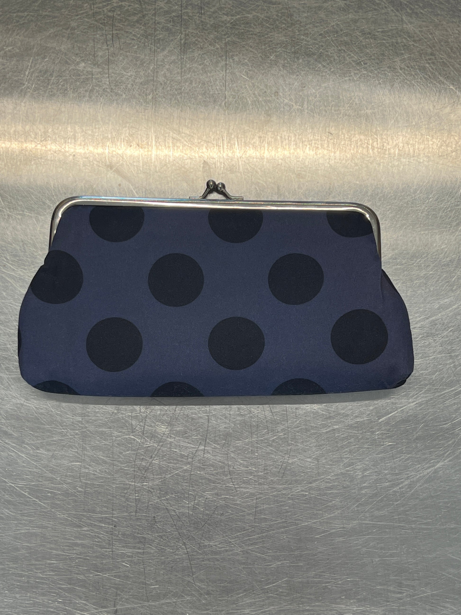 purple wallet/clutch with black dots and pink interior