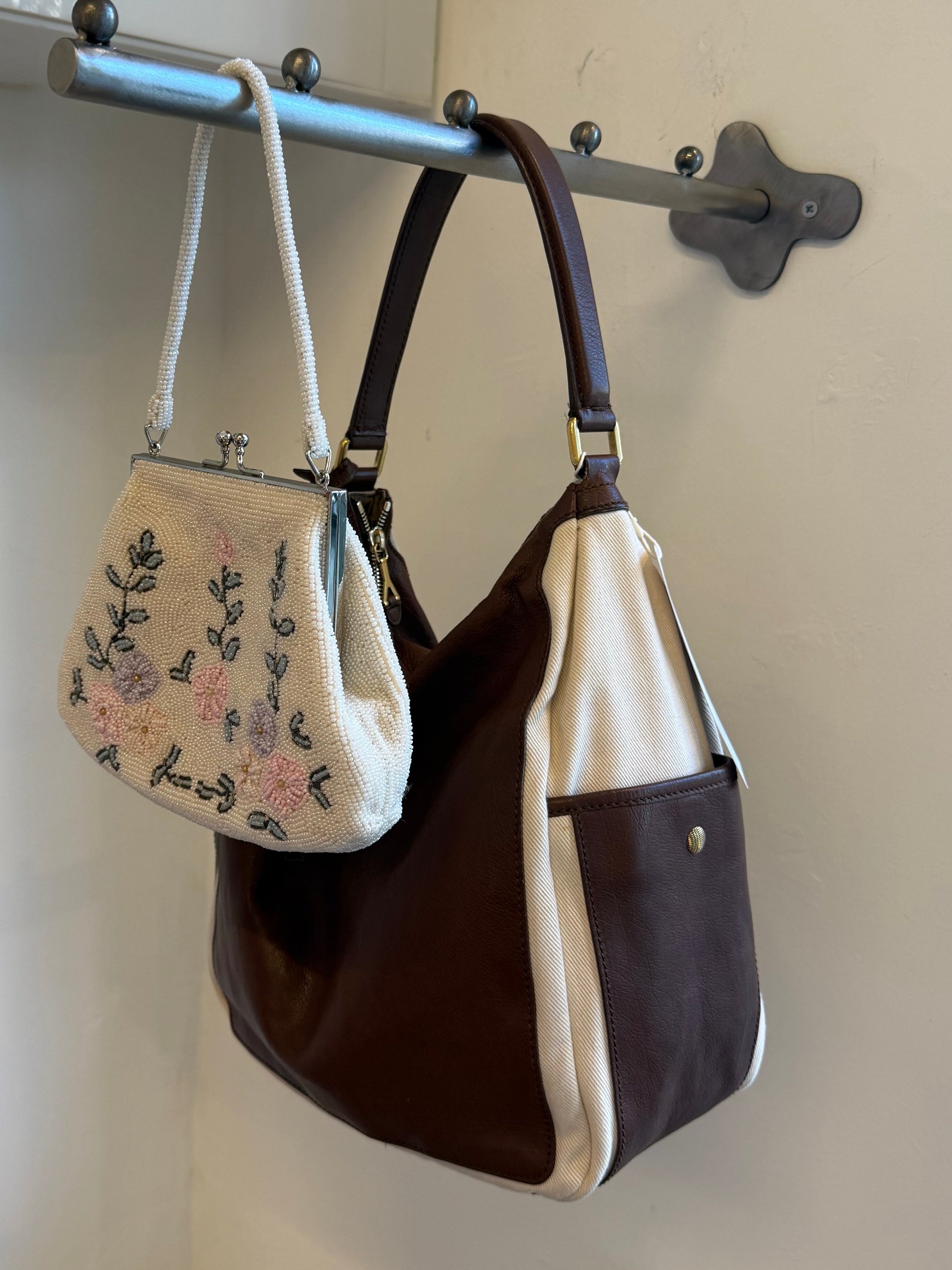 Supple brown leather with contrasting cream canvas sides, top zip closure, and side pocket with flap.