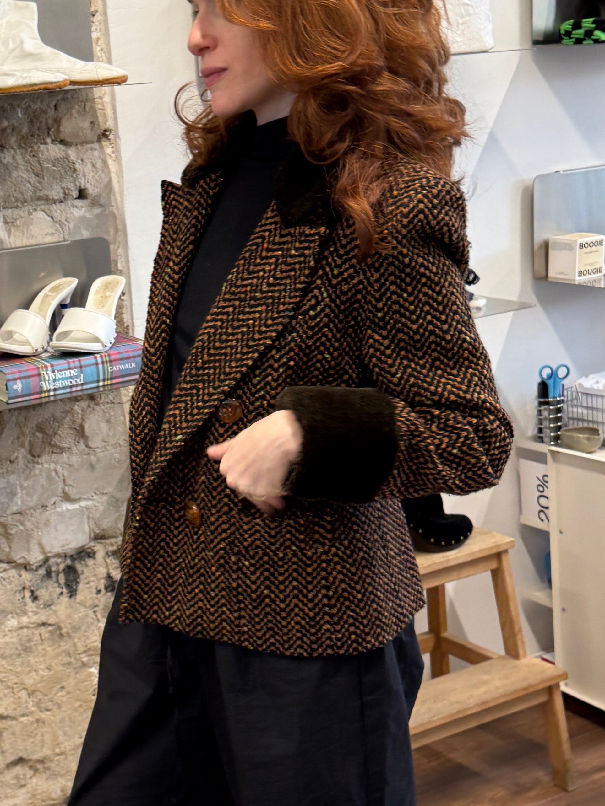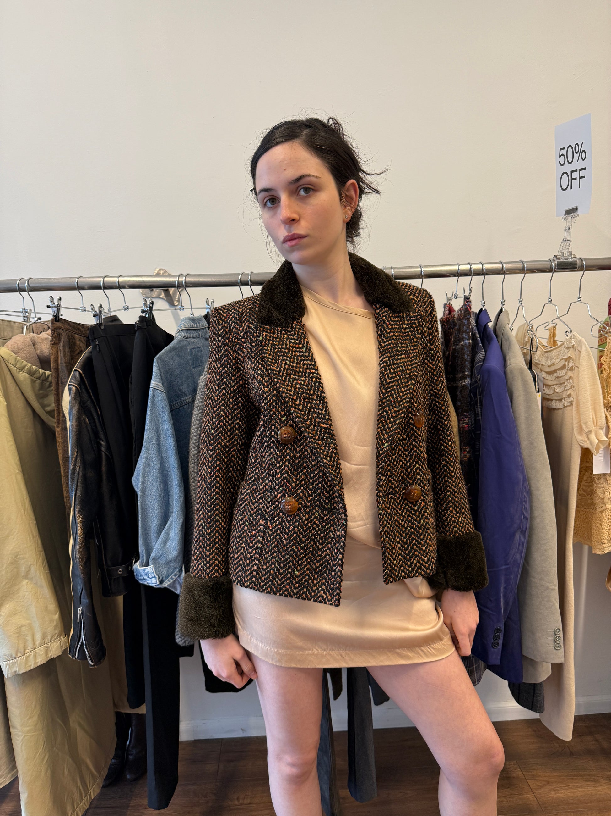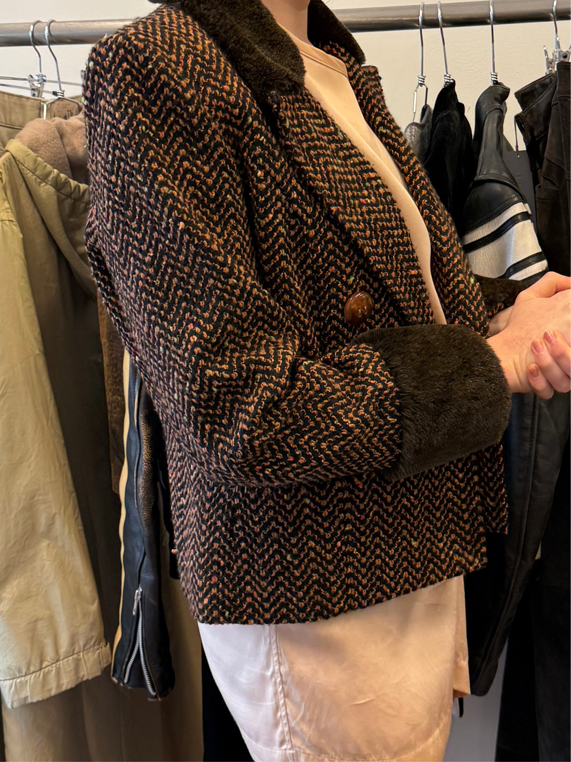 Textured tweed jacket in warm brown tones with a zig-zag weave. Faux fur collar and cuffs (not real fur).