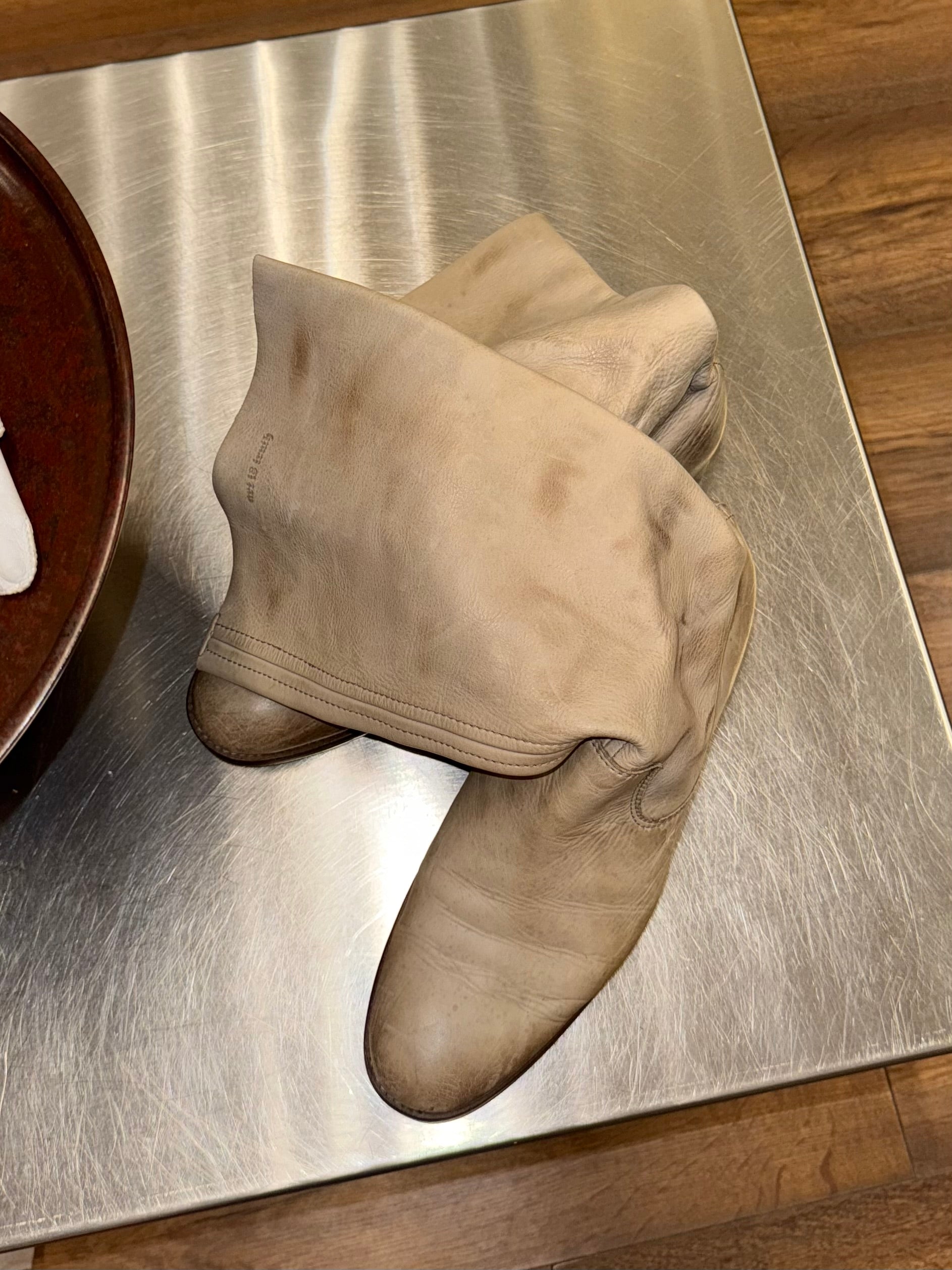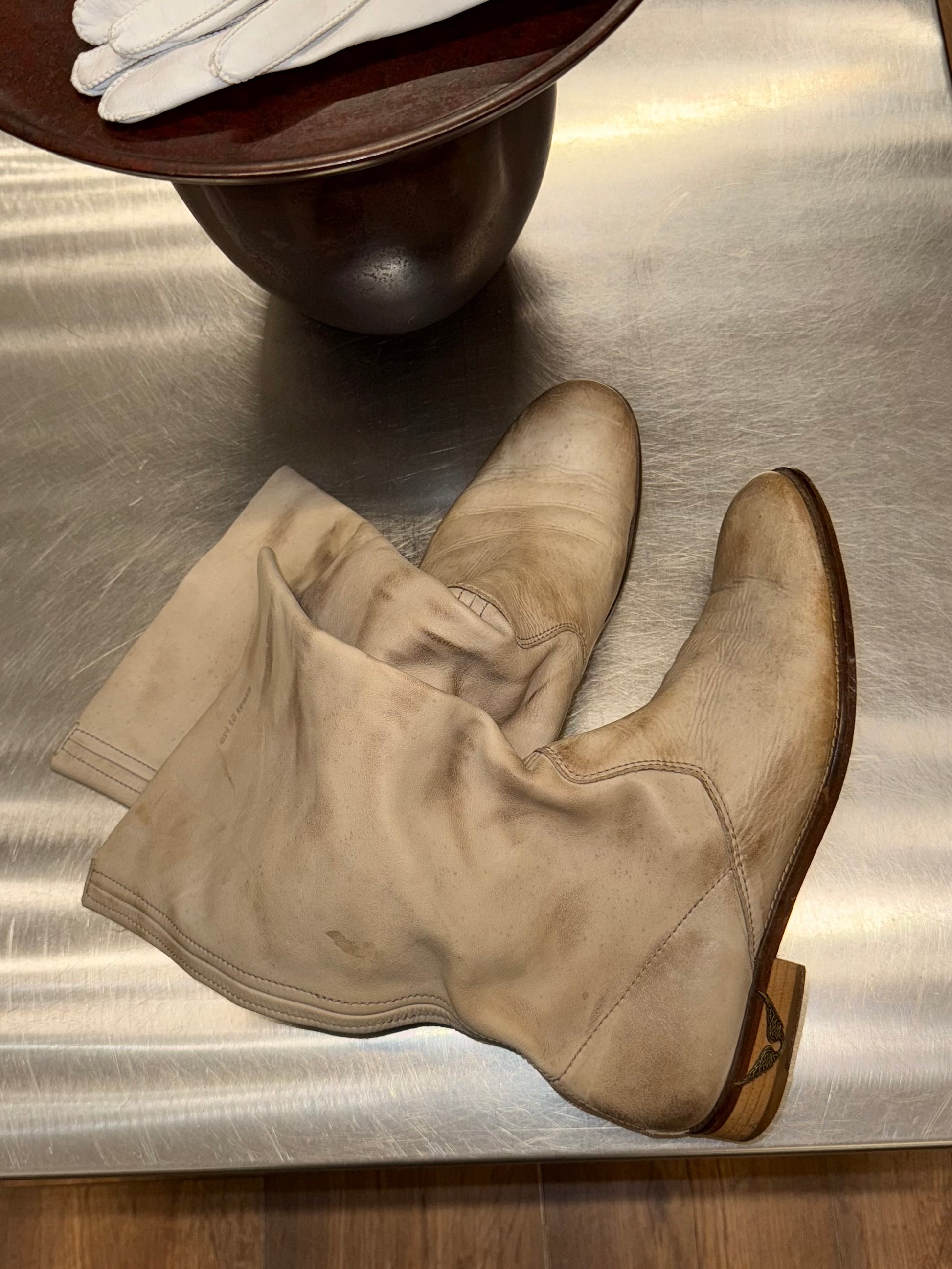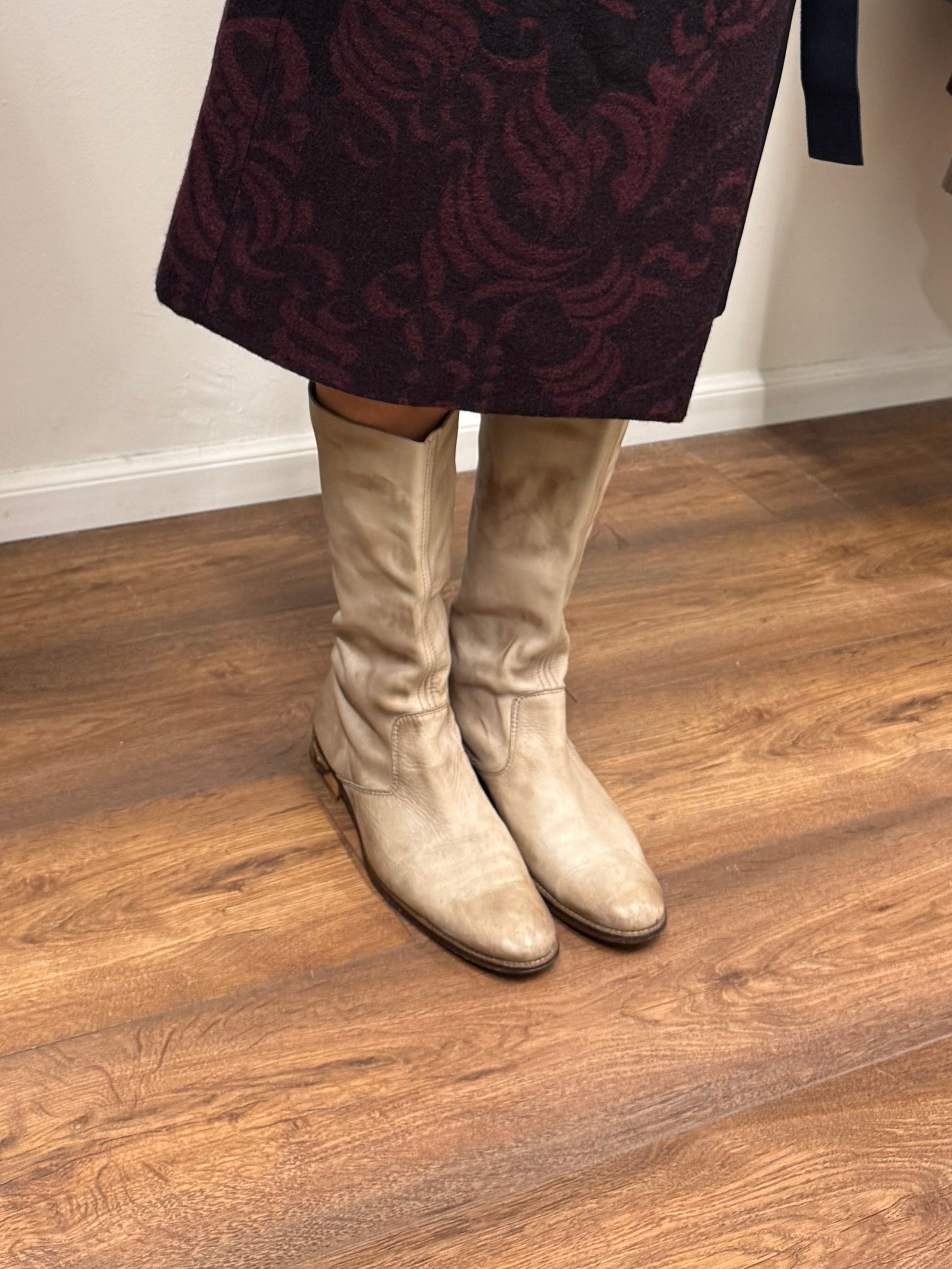 Ivory leather with a relaxed, slouchy shaft, classic western-inspired stitching, stacked heel.