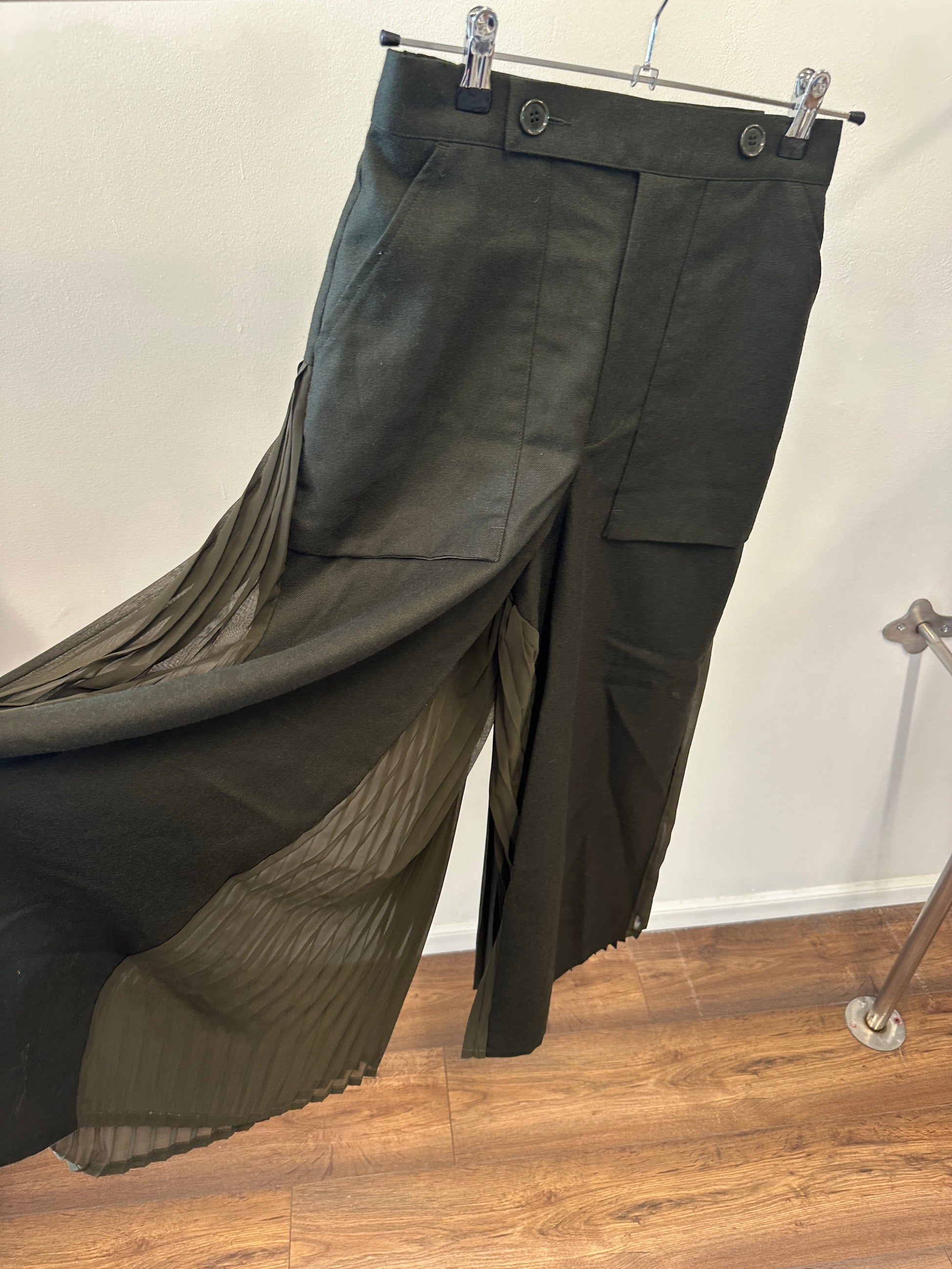 dark green high mid stretch sailor buttons pants with the front being wool and the back is light pleated lighter polyester green that make it look like a skirt and a flap of the same fabric as the front put on the top of the back of these pants